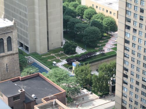 MPFP retrofitted the rooftop plaza, transforming the campus into the lush open space that it is known as today. To circumnavigate structural and spatial constraints, Friedberg placed trees above columns - although this necessitated retaining walls, it presented an opportunity to include additional benches and seat walls to activate the space and accommodate more people. Additionally, the retaining walls offered an opportunity to display a number of pieces from the University’s sculpture gallery.