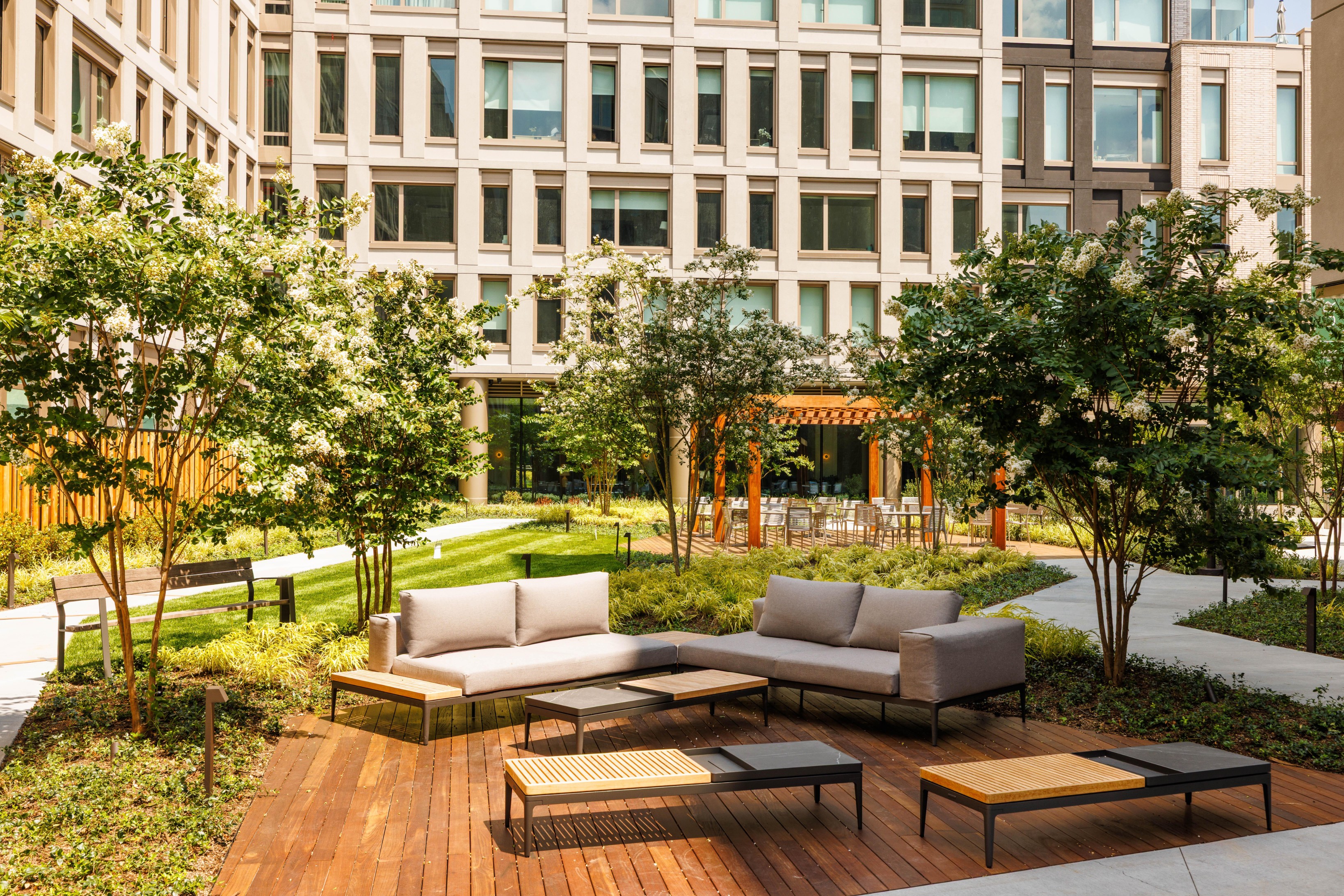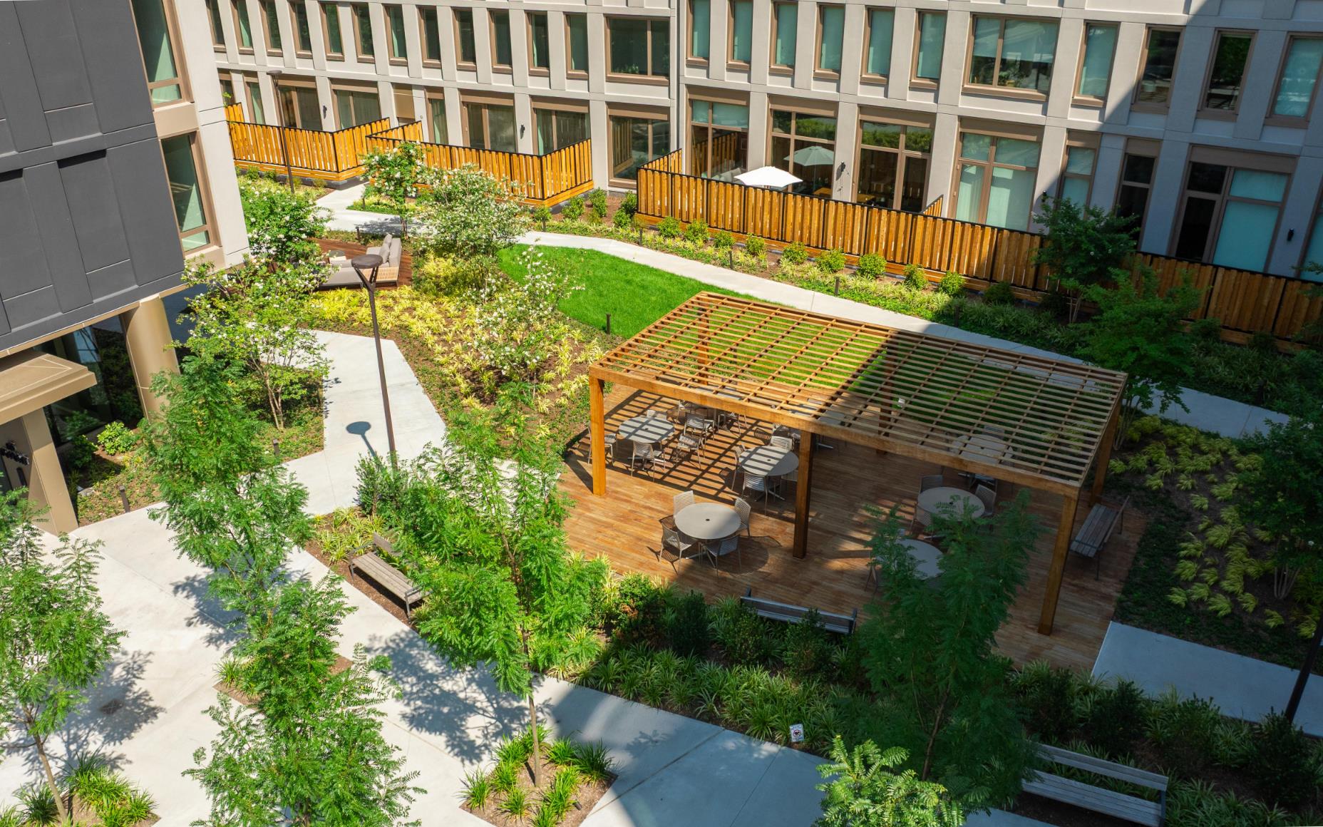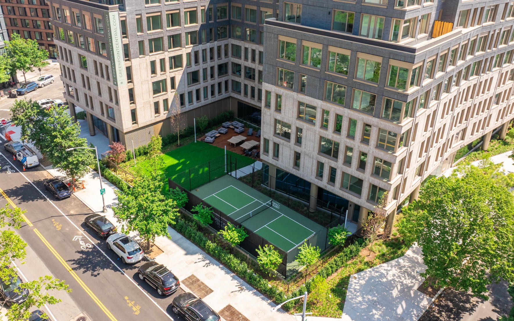 At the west end of the site along Franklin Street, a hedge-screened courtyard features a number of recreational opportunities including a pickleball court, bocce court, corn-hole, and wood deck game-table area.