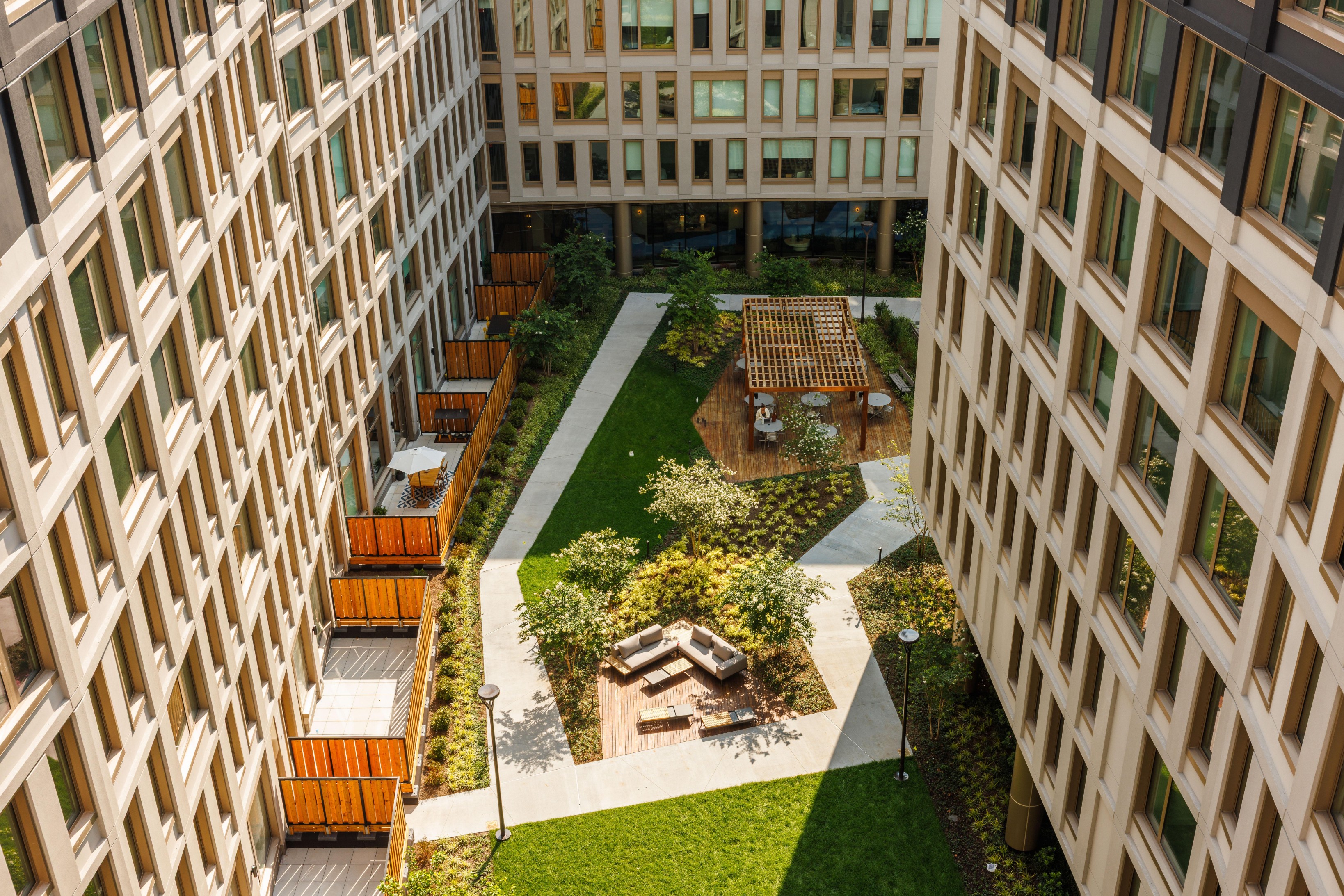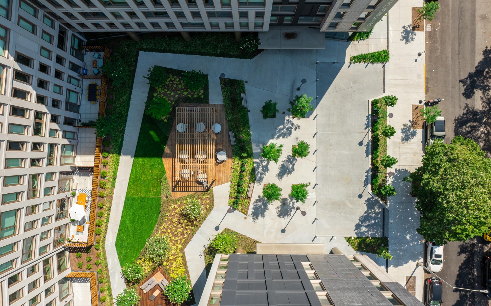 Cultivating an exciting sense of arrival, MPFP’s drive-court entry is alive with color and invites residents into the central courtyard and building lobby. Expanding west on site, the central courtyard features a vibrant array of native plantings set about an expansive open lawn and a trellis-shaded lounge area. Flexible for both passive and semi-active use, the central courtyard functions as Greenpoint Central’s core.