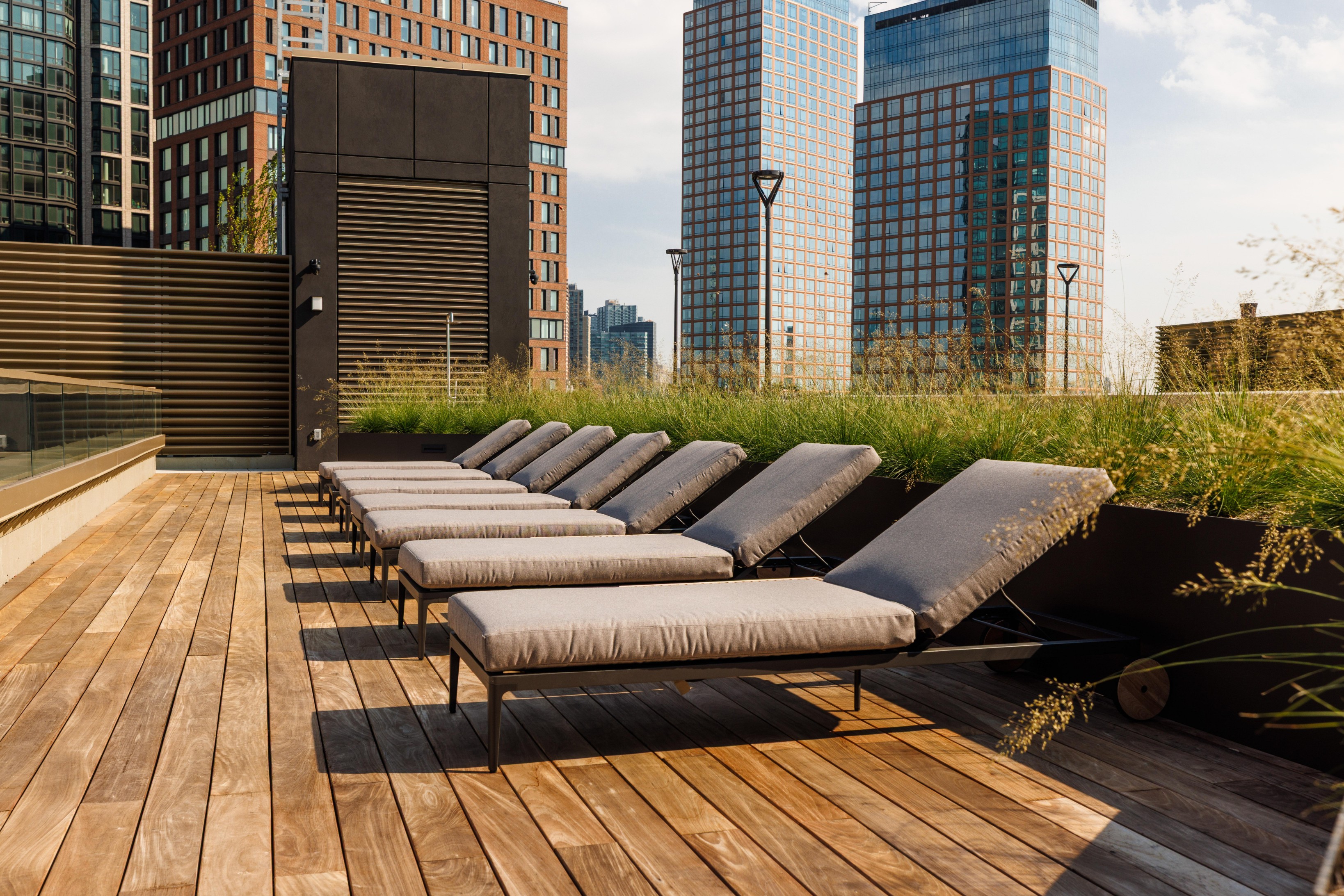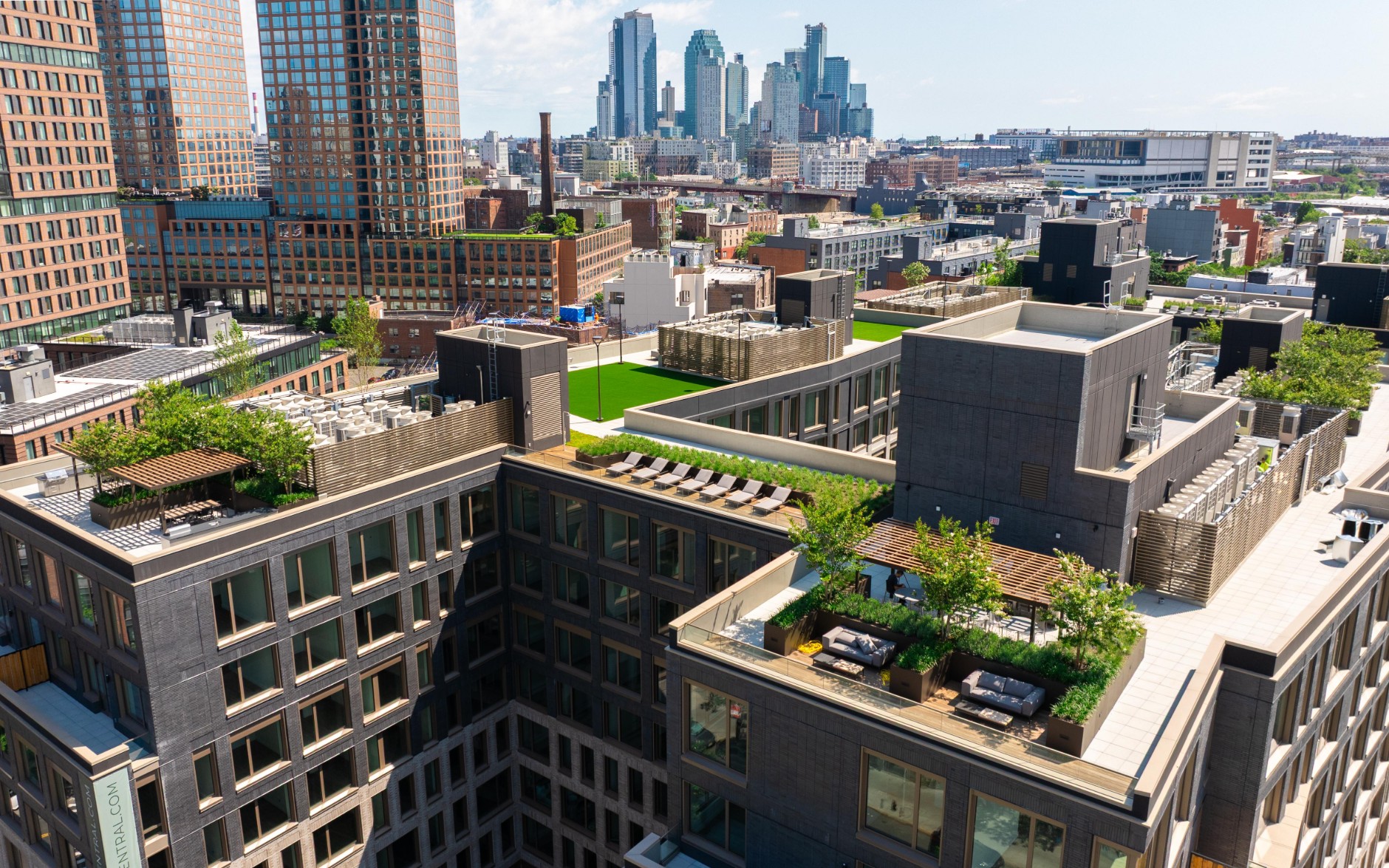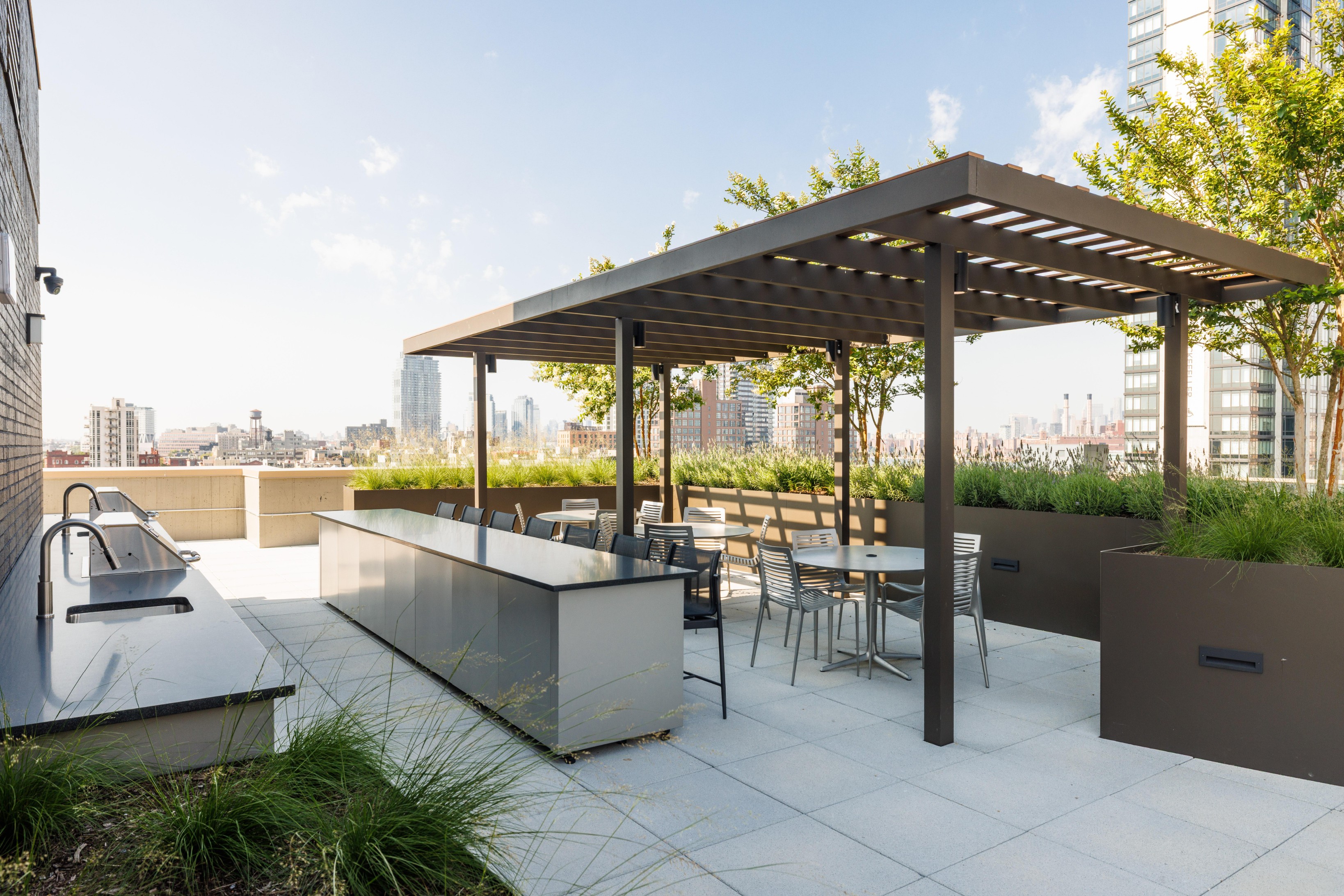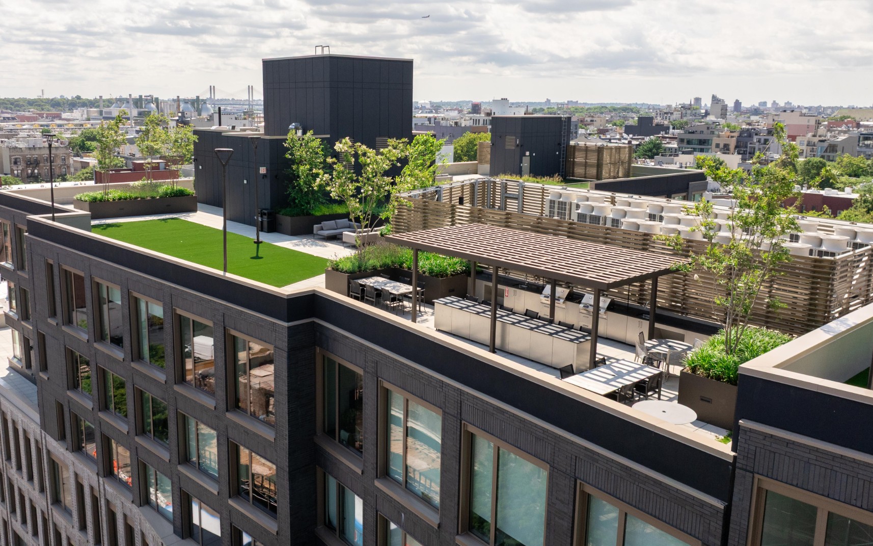 Featuring expressive views of the East River and Manhattan skyline, Greenpoint Central’s roof terrace provides residents with a range of contemporary residential amenities. MPFP designed an array of “garden-rooms” that cater to day-day use as well as special community events. Trellis and tree-shaded outdoor dining areas offer venues for small gatherings, with neighboring garden lounges offering a range of seating. Sun decks with chaise lounges look out onto the river and skyline, while a tree-shaded dog-run considers residents with pets. Elsewhere on the deck, swathes of synthetic turf offer residents a space for picnics or play.